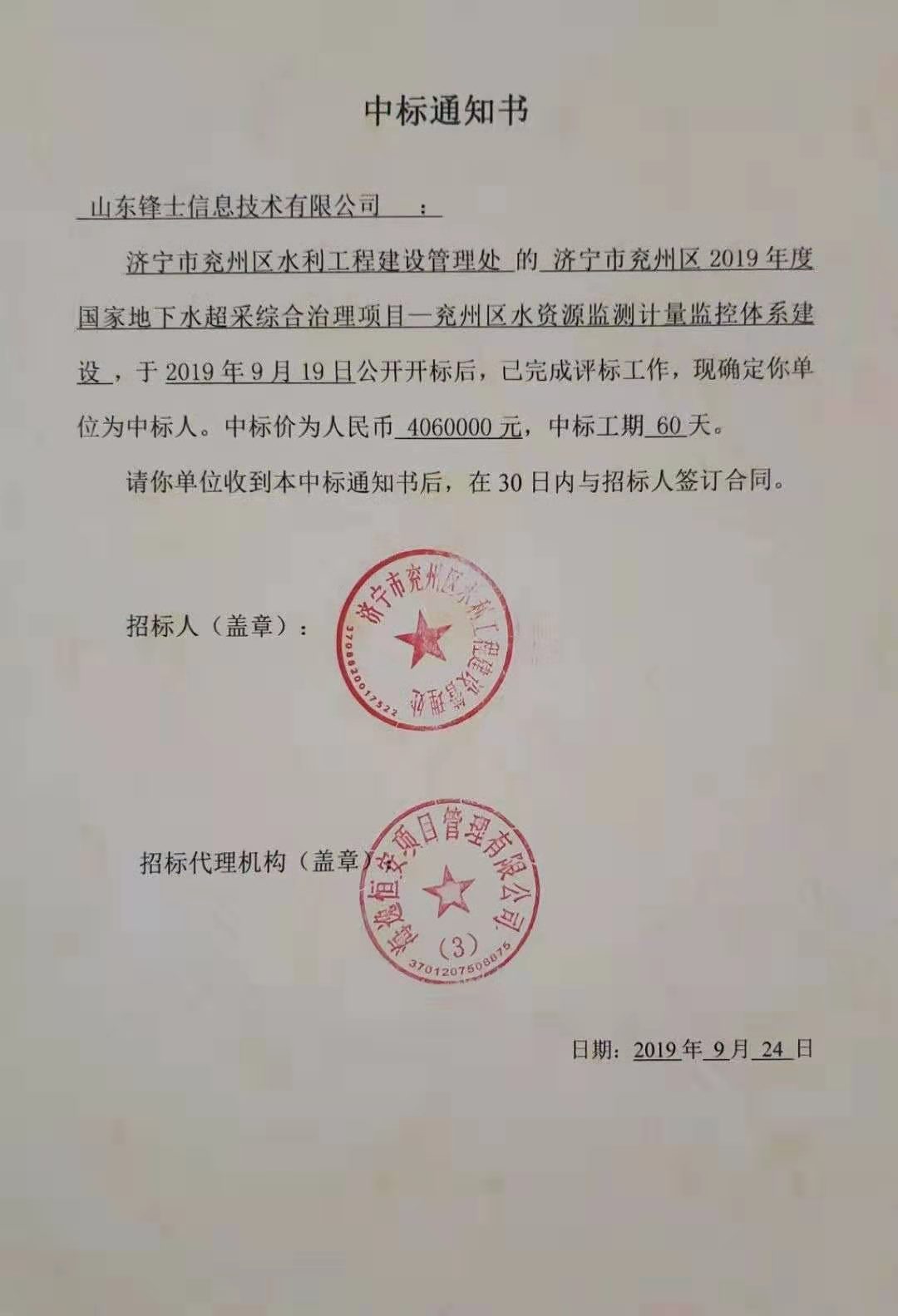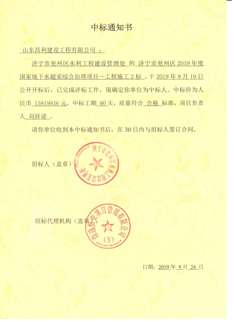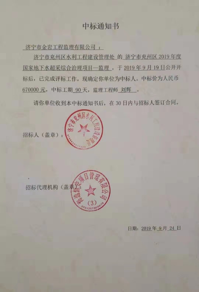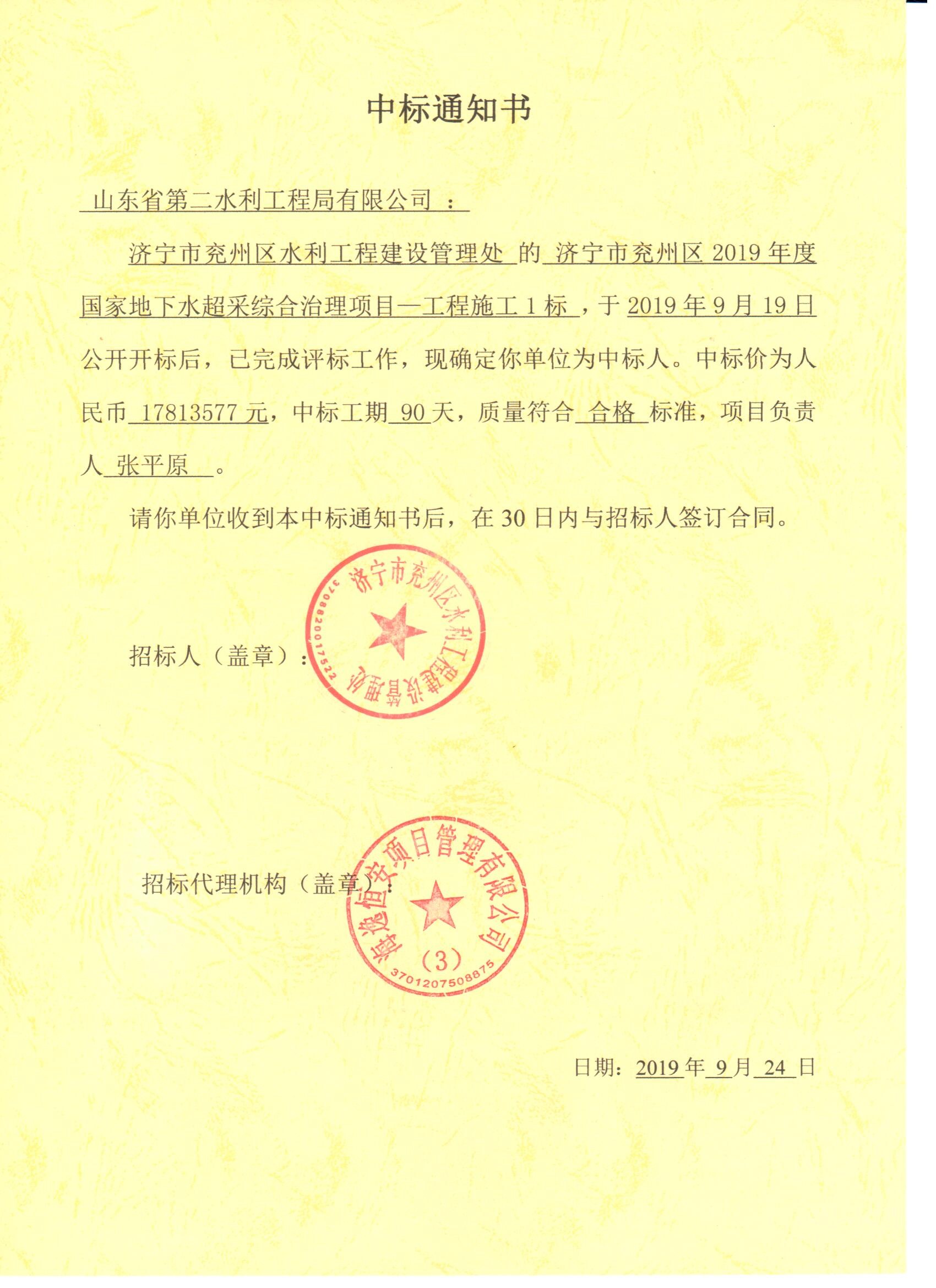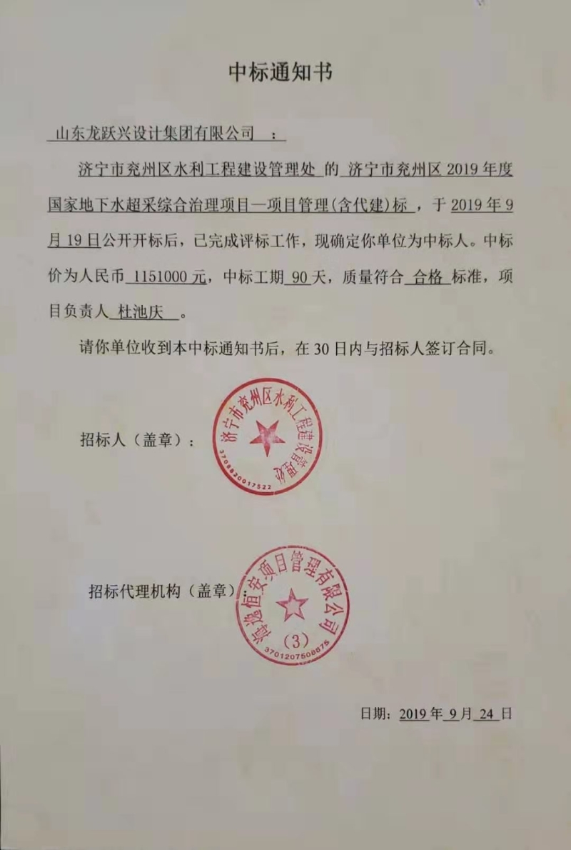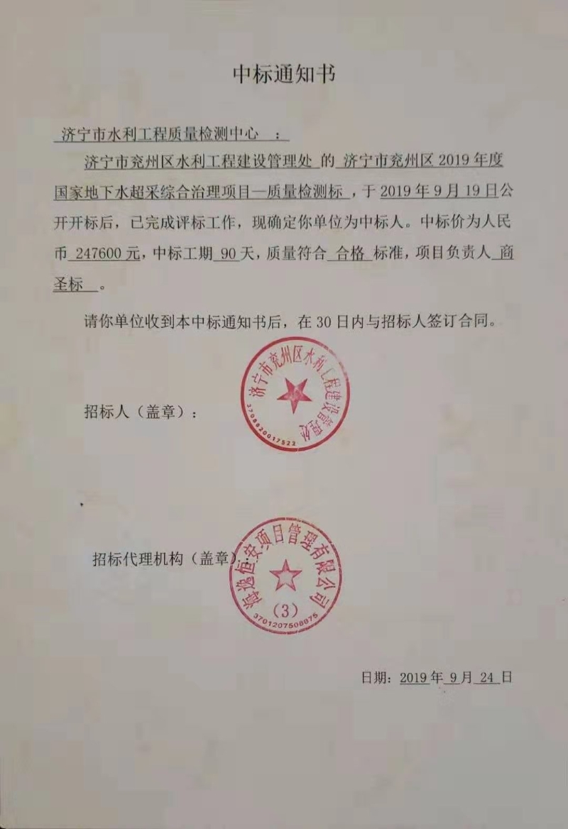 【2019年度國家地下水超采綜合治理項目】中標通知書