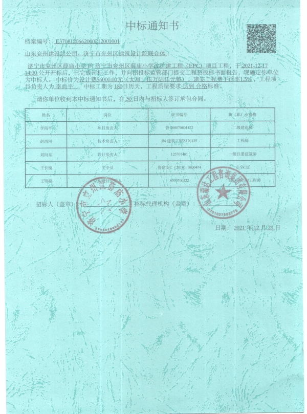 【濟(jì)寧市兗州區(qū)薛廟小學(xué)改擴(kuò)建工程項(xiàng)目】中標(biāo)通知書