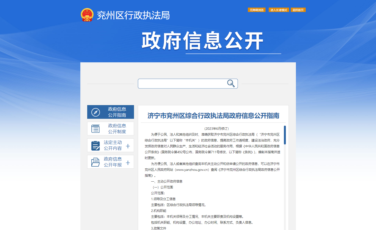 按照市、區兩級政務公開工作的要求,結合實際,對政務信息全面梳理,修訂完善了《兗州區綜合行政執法局信息公開指南》,通過政府信息公開門戶網站等途徑予以公開。以政府信息公開門戶網站為信息公開的主陣地,嚴格按要求在法定時限內及時主動公開行政許可類、行政處罰類“雙公示”信息,便于廣大群眾對相關事宜提出咨詢。