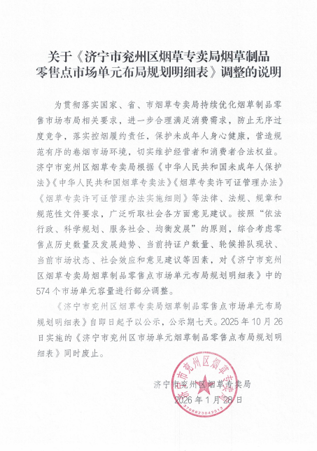 關(guān)于《濟(jì)寧市兗州區(qū)煙草專賣局煙草制品零售點(diǎn)市場(chǎng)單元布局規(guī)劃明細(xì)表》調(diào)整的說(shuō)明