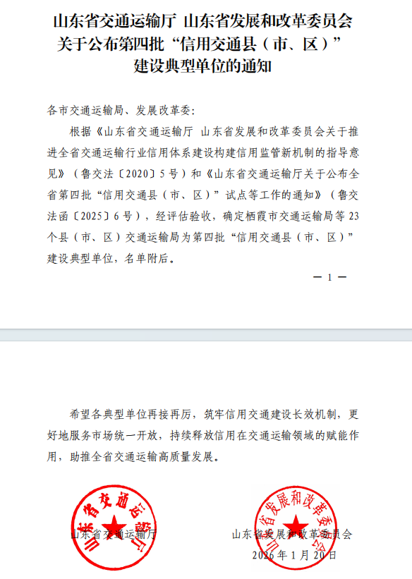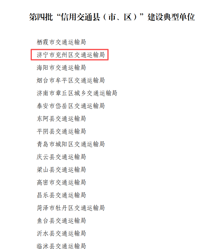 近日,山東省交通運輸廳、山東省發展和改革委員會聯合印發通知,公布第四批“信用交通縣(市、區)”建設典型單位名單,濟寧市兗州區交通運輸局憑借規范有序、特色鮮明的信用交通建設工作成效成功入選,“端信兗州”品牌在交通領域落地生根、結出碩果。